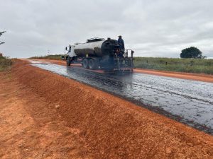 A imprimação consiste na aplicação de material asfáltico sobre a base já concluída, formando uma camada que garante aderência e maior durabilidade ao pavimento. A execução vem após a finalização da base da estrada, finalizada no último fim de semana.
