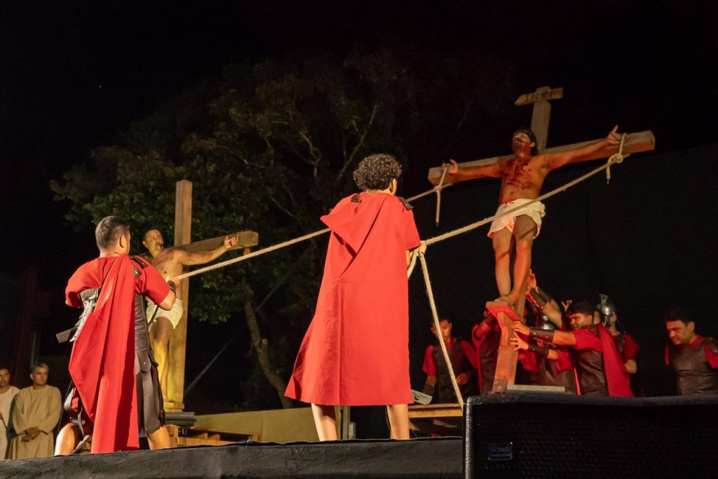 Seguindo até o Calçadão da Gameleira, os fiéis católicos puderam assistir ao encerramento do ato religioso, com a tradicional encenação da crucificação de Jesus Cristo. Neste domingo (5), acontece também na Gameleira o Alvorecer da Ressurreição, que celebra a ressurreição de Cristo. A programação inicia às 3h30, com concentração na Catedral Nossa Senhora de Nazaré, seguida de procissão às 4h e missa às 5h, unindo fé e tradição.
