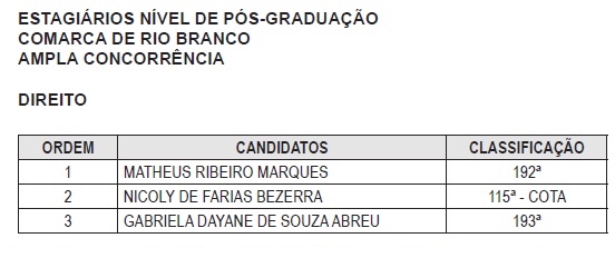 Veja abaixo as convocações feitas na terça-feira, 28, por meio dos editais nº 14/2026 e nº 19/2026, disponíveis na edição nº 8.004 do Diário da Justiça Eletrônico. Nesse lote, foram chamados uma estudante de Pedagogia para atuar em Manoel Urbano e três estudantes de pós-graduação em Direito para Rio Branco.